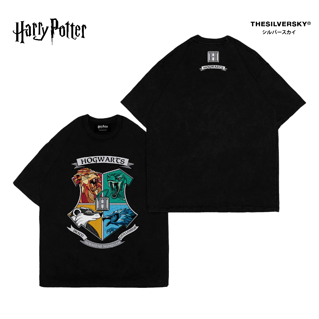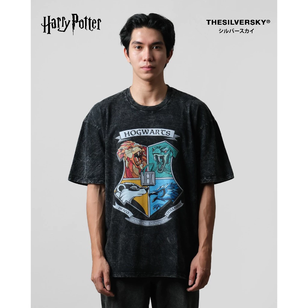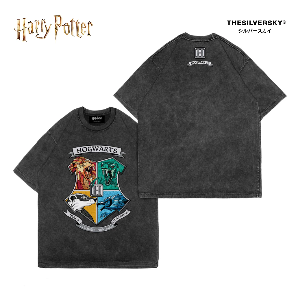 Thesilversky Hogwarts Oversized Washed T-shirt | Official Harry Potter Black Kaos